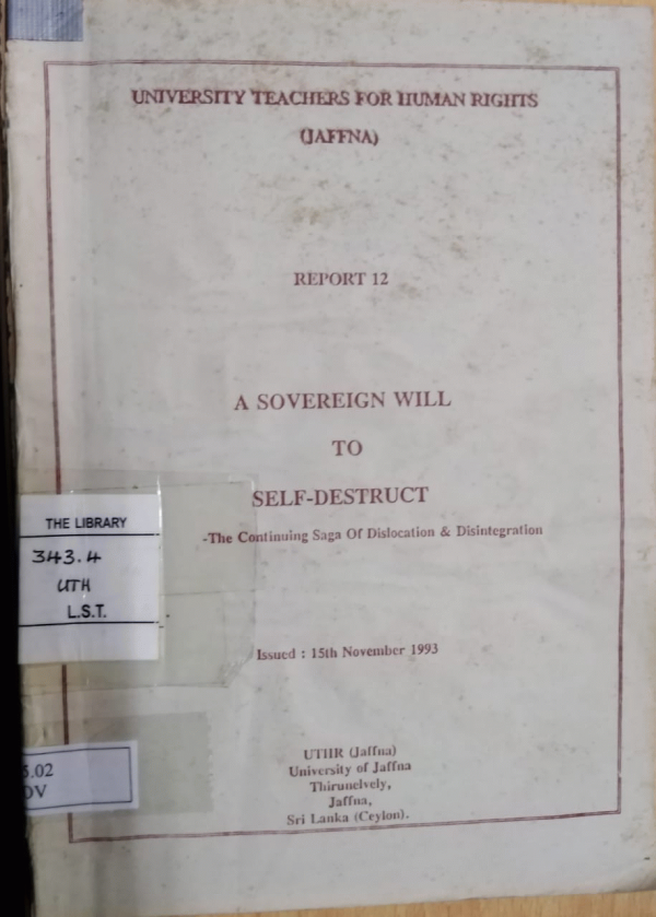 Language: English Language Series: University Teachers for Human Rights Report. No.12 Publication details: Jaffna University Teachers for Human Rights (UTHR) 1993Description: i,87 pISBN:- Not given