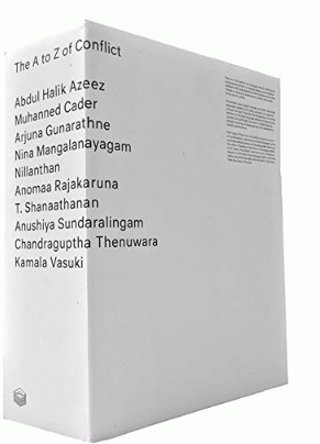'The A to Z of Conflict' is a tri-lingual artists' book by ten contemporary artists. It imagines what a commonplace children's ABC book would look like if all the entries were chosen in relation to words about conflict, and words born out of conflict. The project uses English, Sinhala, and Tamil, the three languages spoken in Sri Lanka, a country torn apart by a brutal civil war. From afar the compendium of entries testifies to the way language defines us linguistically, socially, and politically. Up close it reveals how the complex workings of language have the potential to conjoin and divide us. Each copy of The A to Z of Conflict is bound in one of six combinations, reflecting how three languages can be positioned without giving one language greater status over the other.